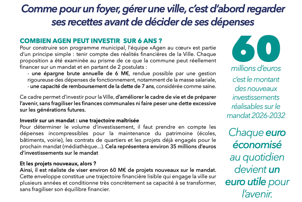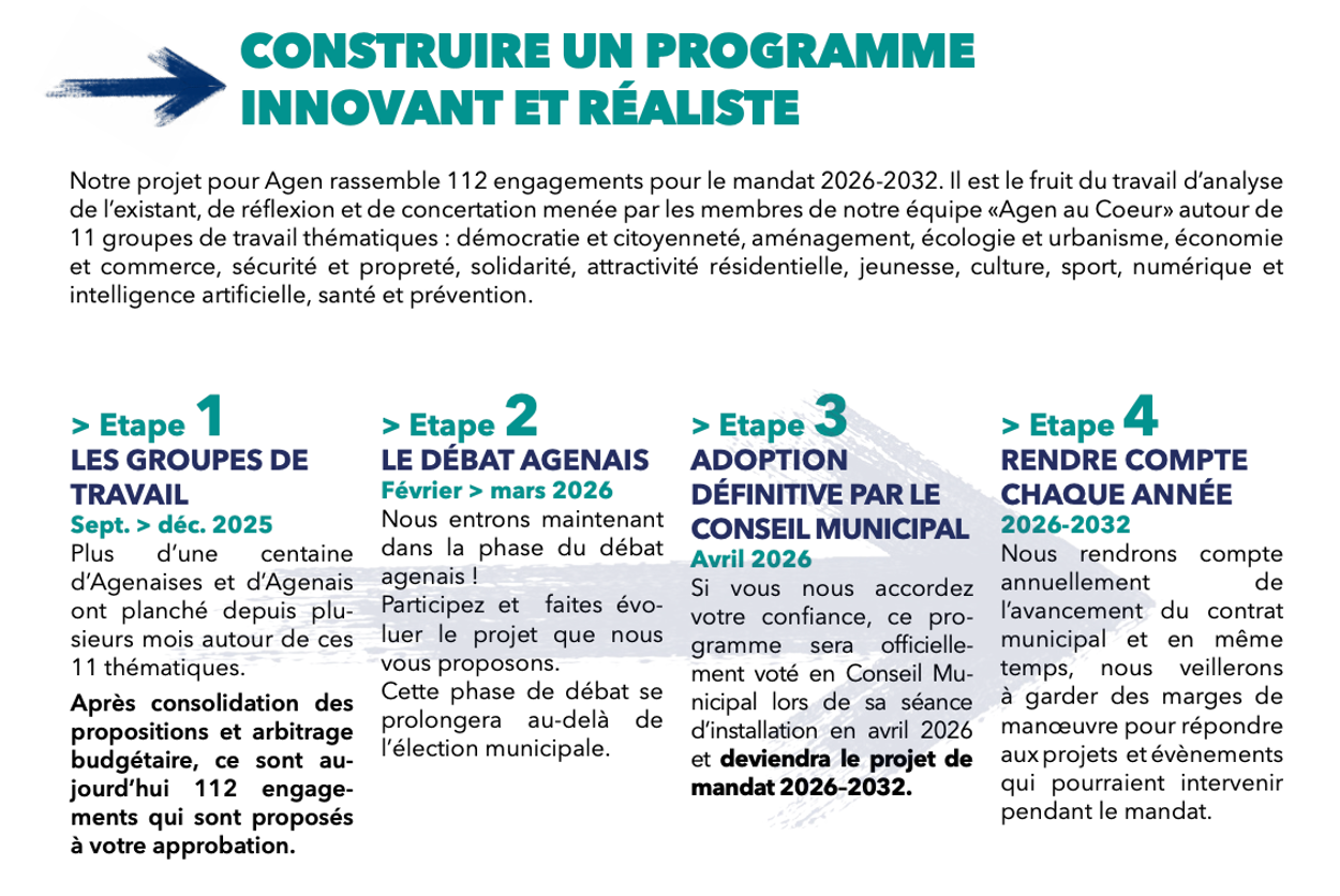 Au nom de tous mes coéquipiers, j'ai le plaisir de vous adresser personnellement notre programme municipal d'actions pour la période 2026-2032, si les Agenaises et les Agenais nous font l'honneur de nous élire pour représenter notre ville pendant cette période.